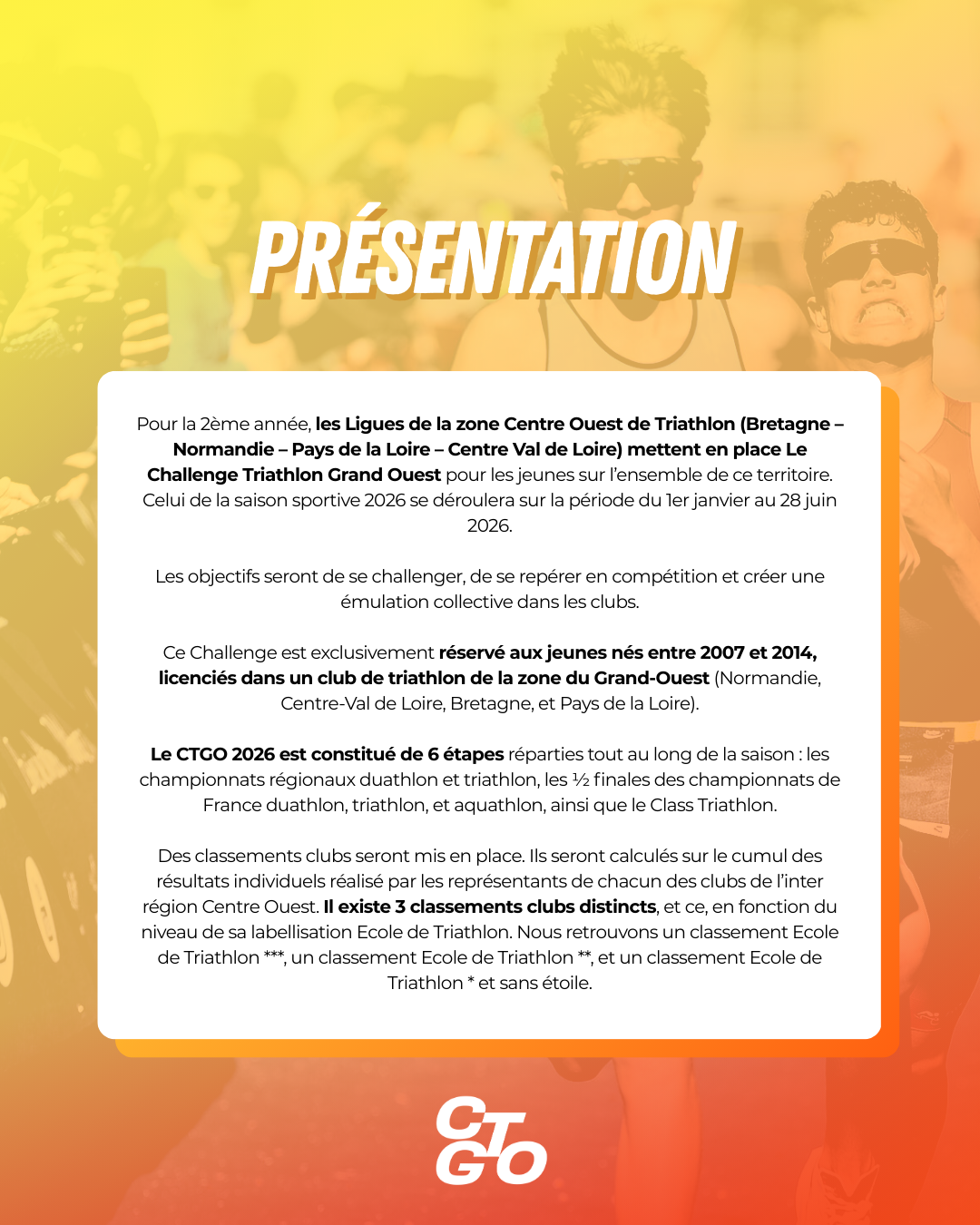 Les Ligues de la zone Centre Ouest de Triathlon (Bretagne, Normandie, Pays de la Loire et Centre-Val de Loire) unissent leurs forces pour lancer le Challenge Triathlon Grand Ouest (CTGO) 2026, un circuit de compétitions conçu pour les catégories benjamins, minimes, cadets et juniors (2007 à 2014).